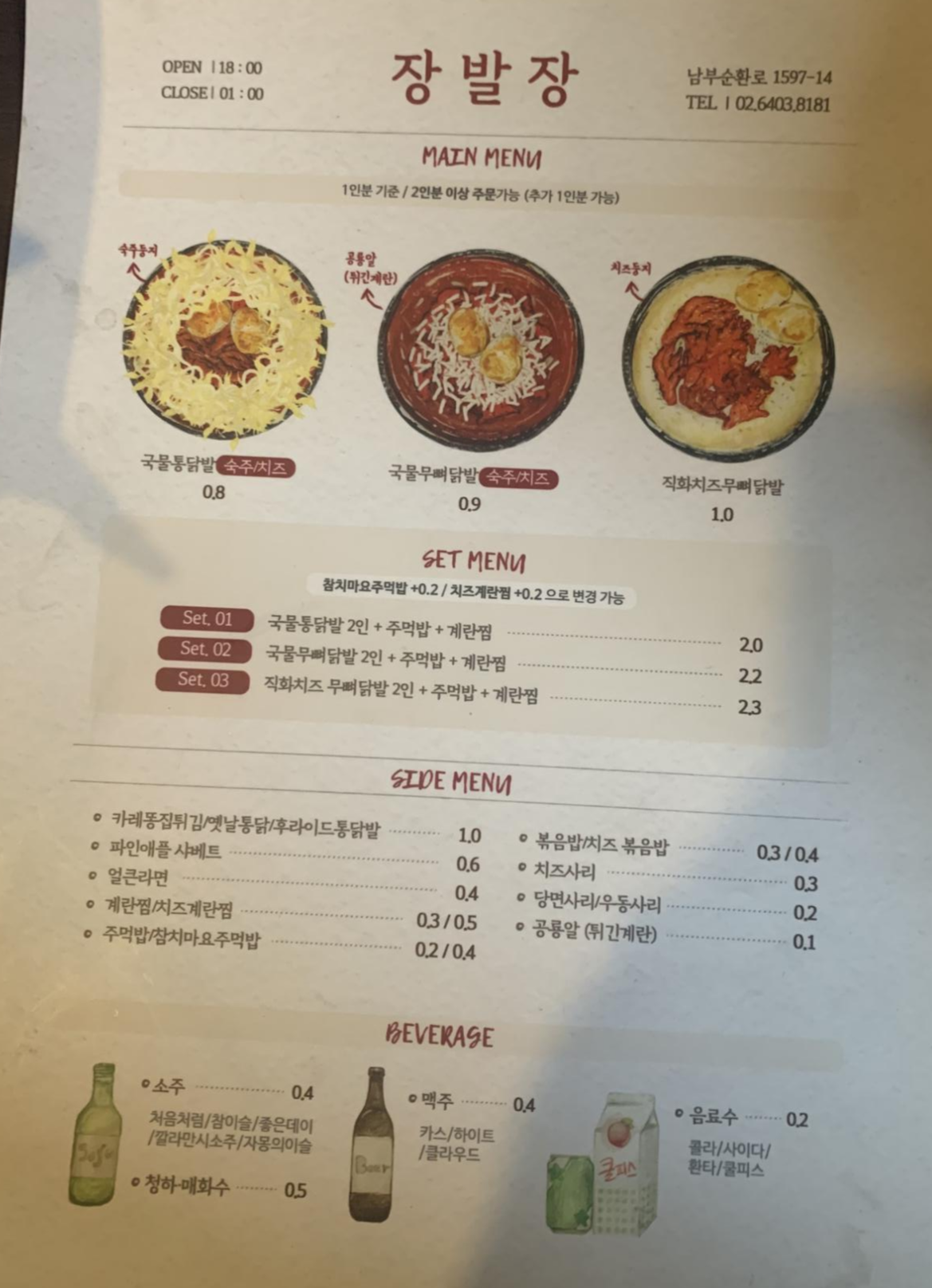 메뉴는 이렇고! 저희는 3명이라 세트1에 국물통닭발 1인 추가했습니다! (주먹밥도 하나 더 먹음ㅎ) 숙주로 선택했구요!
