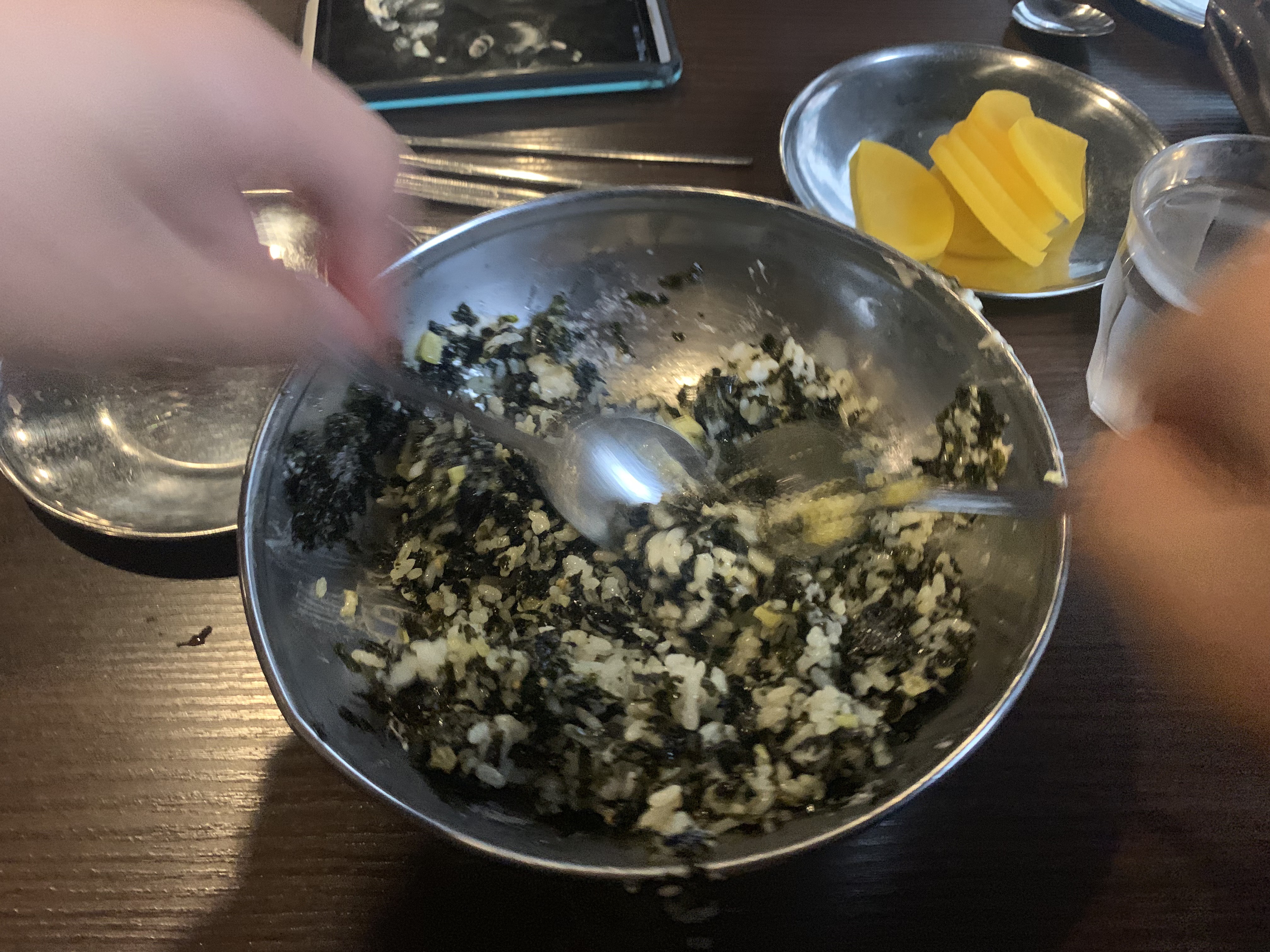 먼저 나온 주먹밥을 야무지게 비비고 있으면